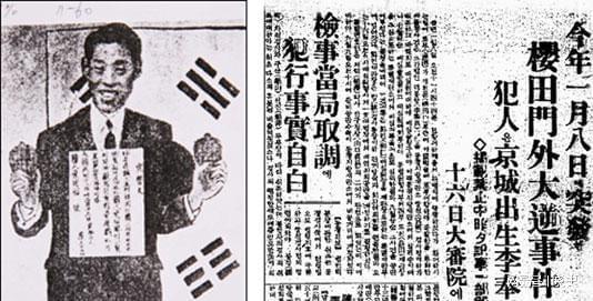 1932年1月8日,韩人爱国团成员李奉昌独身前往日本,在东京樱田门前投掷手榴弹刺杀天皇裕仁,并公开挥舞太极旗,震动日本朝野,直接导致内阁集体辞职。