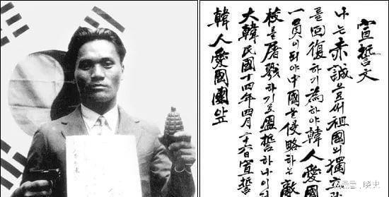 1932年4月26日,尹奉吉正式加入韩人爱国团,他神态坚毅,左手握住一枚手榴弹,右手持一支手枪,胸前挂着韩人爱国团宣誓文,在太极旗下留下了行动前最后的影像。